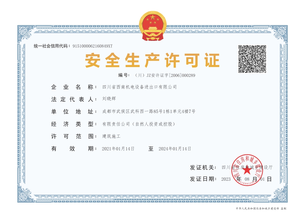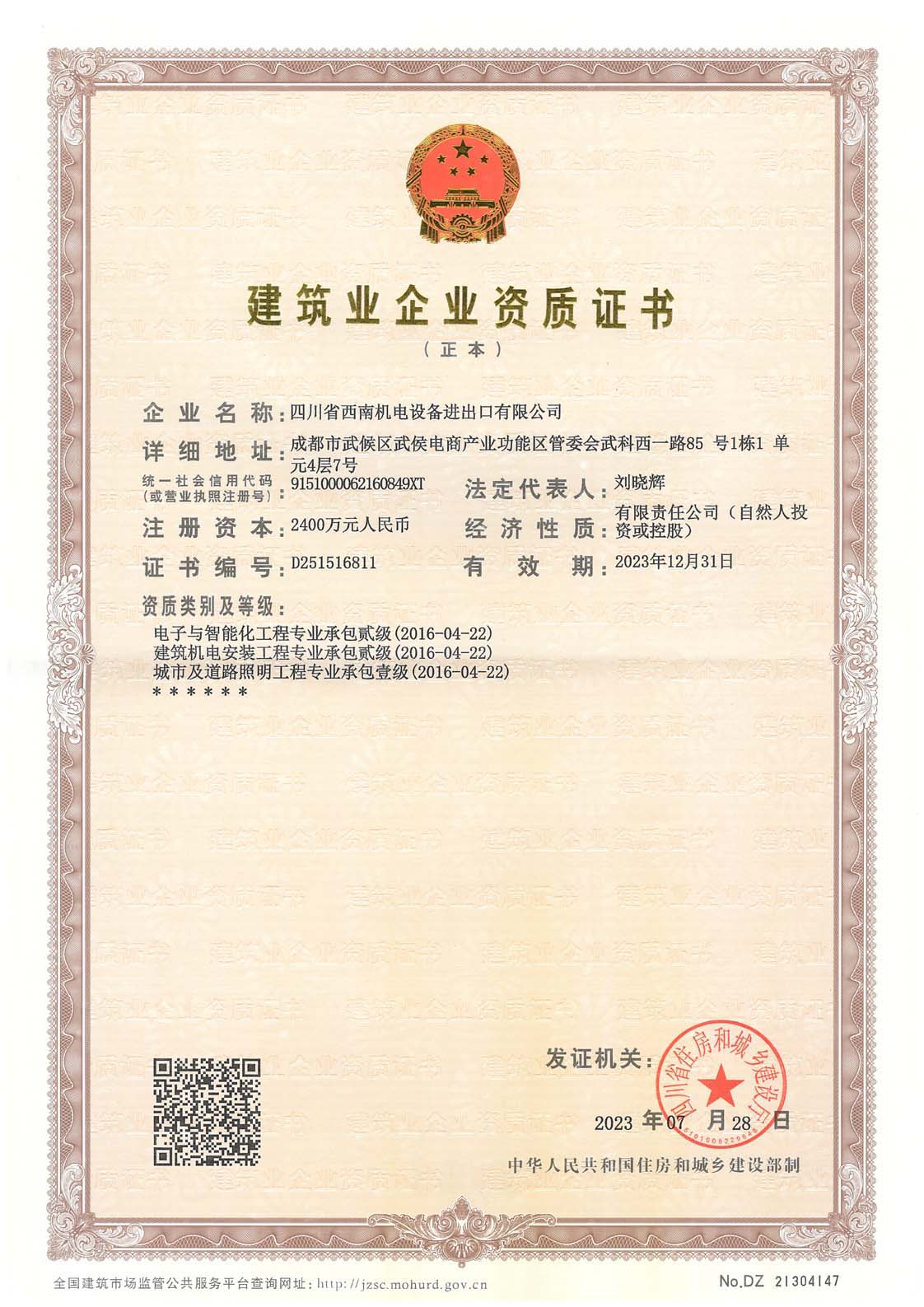 四川省西南機電設備進出口有限公司是具有進出口經營權并代理銷售國內外機電、照明、建材產品及從事機電設備、空調設備、電梯設備、環保設備、電站設備、工程礦山設備、智能樓宇設備、照明工程、儀器儀表及自控系統的成套設計、供貨、安裝、調試、技術支持與人員培訓,并提供優質、高效服務的專業單位。公司具有國家建設行政主管部門頒發的照明工程設計專項乙級資質證書,建筑機電安裝工程專業承包二級、城市及道路照明工程專業承包一級、電子與智能化工程專業承包二級和安全生產許可證證書。具有四川省質量技術監督局頒發的電梯設備安裝A級、維修A級資質證書。現有員工70余人,其中一級注冊建造師2人,二級注冊建造師10余人、高級職稱3人,中級職稱20余人、專職安全員5人、管理及技術人員30余人。